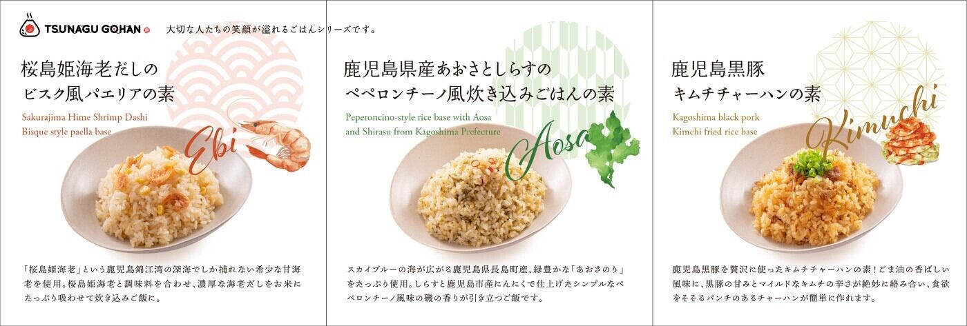 つなぐごはんシリーズは、鹿児島の厳選食材を使用した商品が全3種類あります。
